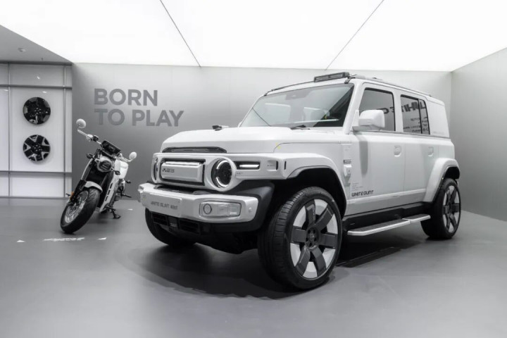 车身上部,是纯粹的OneBox造型,线条流畅舒展,极致追求低风阻与科技感;腰线之下,却陡然切换为硬派越野的强悍姿态,超高离地间隙、超大轮毂与宽体轮眉,营造出强烈的力量感。这种“上半身流线,下半身硬派”的冲突,造就了其独一无二的未来姿态。