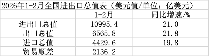3月10日,海关总署公布2026年1-2月外贸数据。以美元计,2026年1-2月,中国进出口总值10995.4亿美元,同比增长21.0%。其中,出口6565.8亿美元,同比增长21.8%;进口4429.6亿美元,同比增长19.8%;贸易顺差2136.2亿美元。